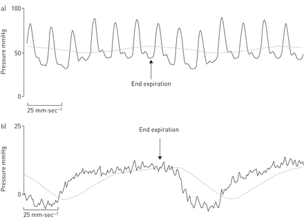 Exemplo de curvas de pressão obtidas no cateterismo direito, variando conforme a respiração.