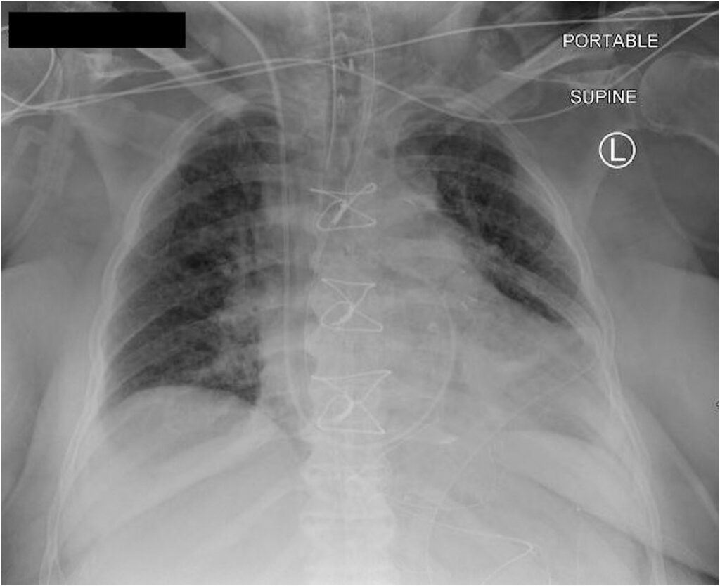 Exemplo de Radiografia realizada durante o procedimento, mostrando um cateter inserido pela região cervical direita e com trajeto até câmaras cardíacas direitas.